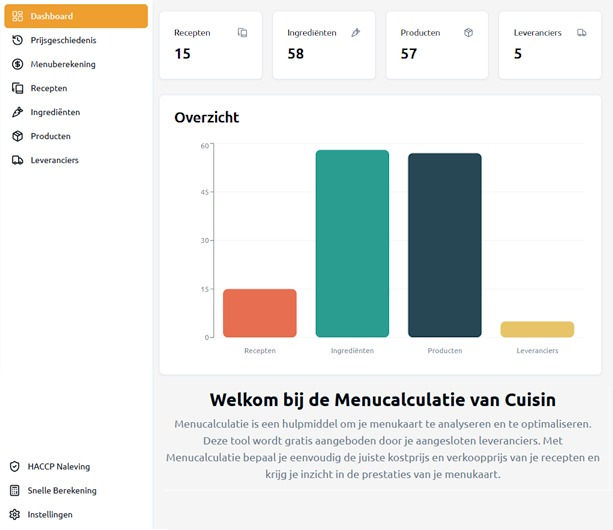 Cuisin introduceert een nieuwe, ๐ค๐จ๐ฌ๐ญ๐๐ฅ๐จ๐ณ๐ service voor de horeca: de Menucalculatieโapp, een gebruiksvriendelijke tool waarmee ondernemers hun recepten en menuโs eenvoudig kunnen vastleggen, beheren en actualiseren. De app wordt zonder voorwaarden beschikbaar gesteld door de aangesloten leveranciers van Cuisinโgeen verborgen kosten, geen ingewikkelde constructies.